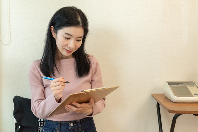 待合室でゆっくりご記入ください。お悩みの症状などを書いていただきます。分かる範囲でご記入いただき、後ほどカウンセリングで詳しくお聞きいたします