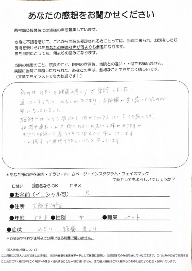 初めはめまいと頭痛と肩こりで受診しました。通っているうちに、めまいがおさまり、毎朝頭が重く感じていたのが楽になっていました。