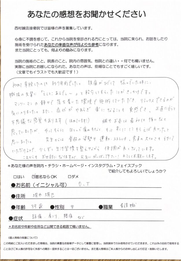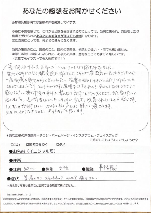 2~3年前から首肩のこりがひどくてつらい毎日を送っていたのですが、西村先生に1度診察をしてもらおうと思い、たずねて見てもらいました。つづけることにしました。8か月くらいたったころから、すごく体が楽になってきました。こんな事なら、もっと早く見てもらえばよかったなと思っています。ほんとうにありがとうございました。