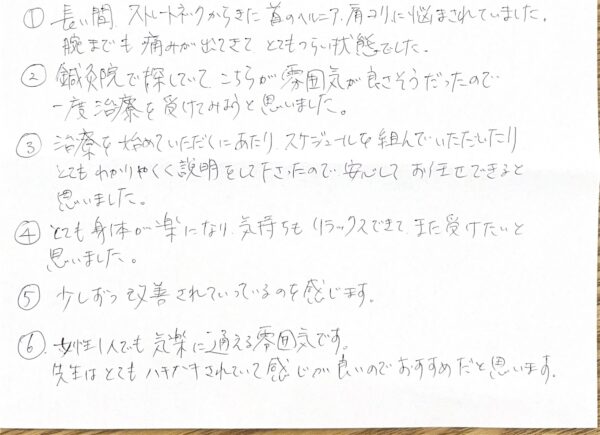 言葉だけでの説明ではなく、文章で書いて下さっているので、しんどい時に何度も読み返す事が出来るので、励みになりました。とてもソフトな施術で、全身の状態を整えて頂き、施術中も食事や正しい姿勢、ストレッチなどの仕方を教えて下さいます。