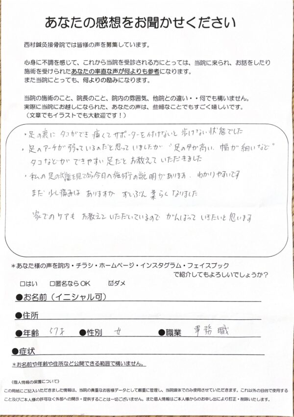 足の裏にタコができ痛くてサポーターをつけないと歩けない状態でした。