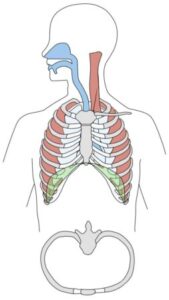 背骨や骨盤のゆがみで、肋骨の動きが抑えられ、肺(胸膜)が膨らまず、呼吸が浅くなっています。